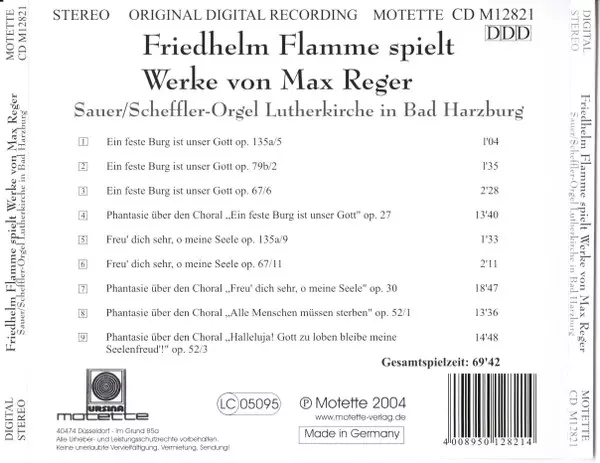 | Titel | Friedhelm Flamme Spielt Werke Von Max Reger U. A. Vier Choralfantasien An Der Sauer/Scheffler-Orgel Der Lutherkirche In Bad Harzburg |