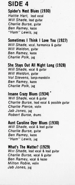 Guitar Charlie Burse | Harmonica Will Shade | Jug Jab Jones | Vocals, Banjolin [Banjo-Mandolin] Vol Stevens | Vocals, Harmonica Charlie Nickerson