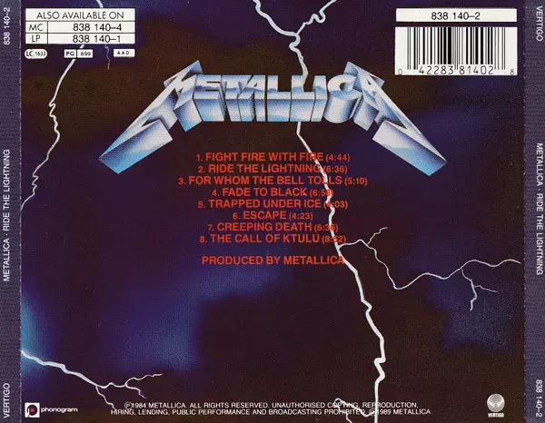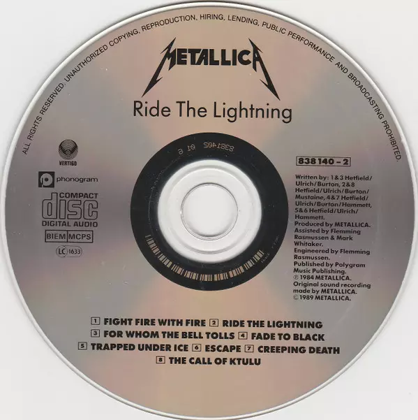 Metallica: Ride The Lightning versie op CD in standaard editie. Deze specifieke uitgave werd uitgebracht in Europa en VK bij uitgeverij Vertigo in samenwerking met Phonogram op 12. september 2016.