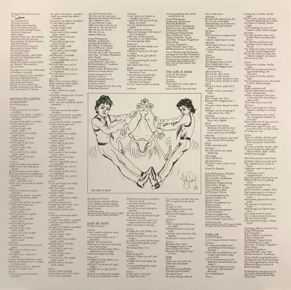 Arranged By [Horn Arrangement] Jerry Hey | Arranged By [Vocal, Rhythm And Synthesizer Arrangement] Rod Temperton | Effects Bruce Cannon, Bruce Swedien | Featuring, Rap Vincent Price (2) | Guitar David Williams (4) | Programmed By [Synthesizer Programming] Anthony Marinelli | Saxophone, Flute Larry Williams | Synthesizer Brian Banks, Greg Phillinganes, Rod Temperton | Trombone Bill Reichenbach (2) | Trumpet, Flugelhorn Gary Grant, Jerry Hey | Vocals [Lyrics Sung By] Michael Jackson | Written-By Rod Temperton