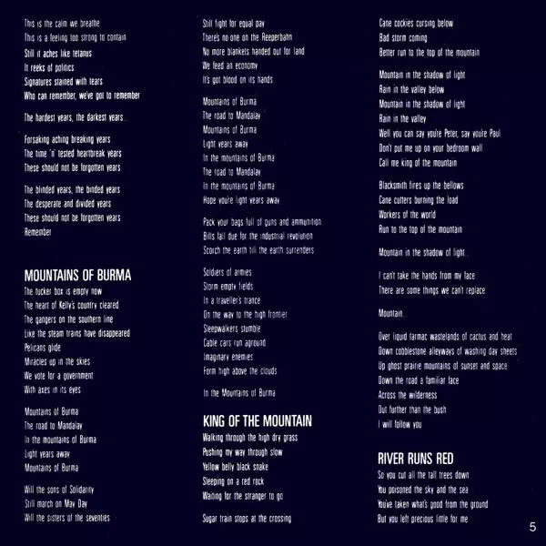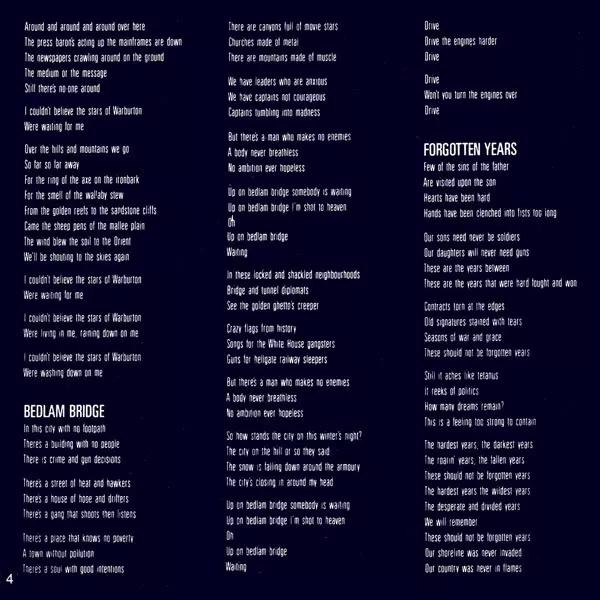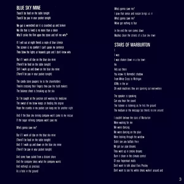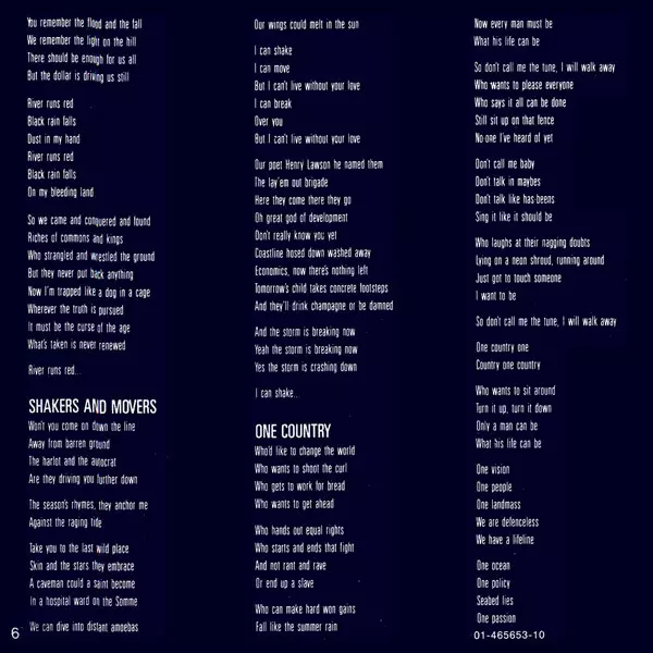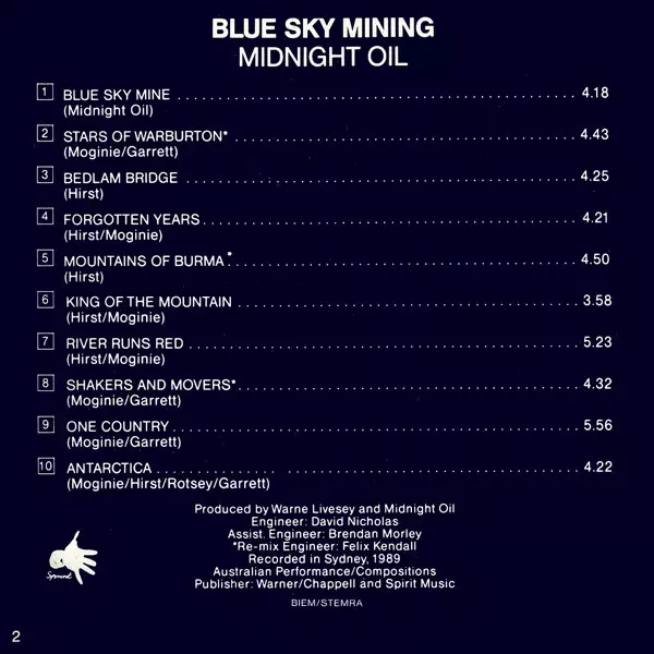 On their seventh album "Blue Sky Mining", the band focused on international music on tracks like "One Country", "Blue Sky Mine" and "Forgotten Years" without losing their distinctive Australian voice. On a US tour following the album's release, the band drew attention to the environmental disaster caused by an Exxon tanker running aground in Ala...