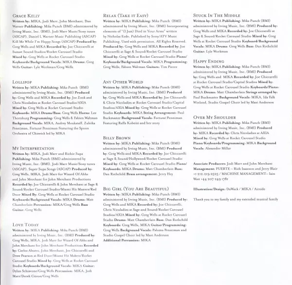 Bass Dan Rothchild | Drums Greg Wells | Guitar Lyle Workman | Keyboards, Backing Vocals MIKA (8) | Mixed By Greg Wells | Producer Greg Wells | Recorded By Joe Chiccarelli | Written-By MIKA (8)