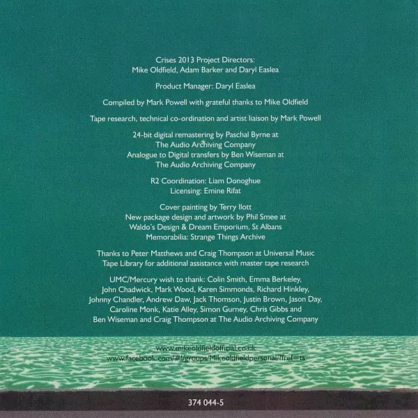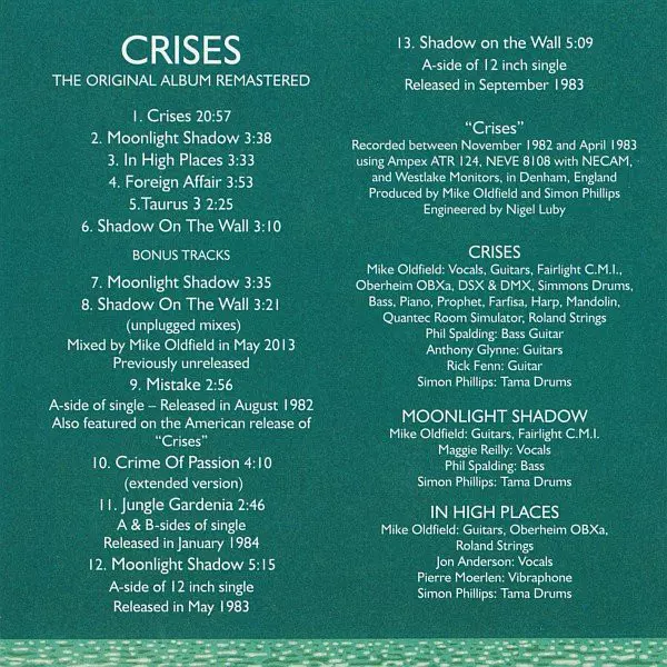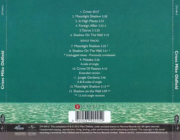 Mike Oldfield: Crises versie op CD in remastered editie. Deze specifieke uitgave werd uitgebracht in Europa bij uitgeverij Mercury in samenwerking met Universal Music Catalogue op 10. september 2013.