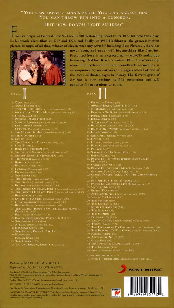 Miklós Rózsa: Ben-Hur A Tale Of The Christ versie op 2CD in standaard editie. Deze specifieke uitgave werd uitgebracht in Verenigd Koninkrijk bij uitgeverij Sony Music in samenwerking met Sony Classical op 23. oktober 2015. Album valt binnen het genre Klassieke muziek, Stage & Screen, Partituur en Soundtrack.