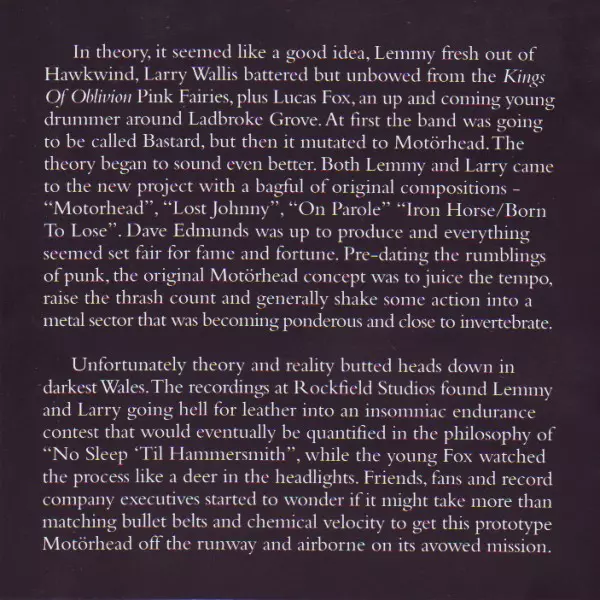 Motörhead's third album On Parole was released in 1979. It was the band's first album released on Chiswick Records and was produced by Jimmy Miller. On Parole was the band's first album to feature Phil "Philthy Animal" Taylor on drums. It was also the band's first album to feature Lemmy Kilmister singing and playing bass guitar. The album was a ...