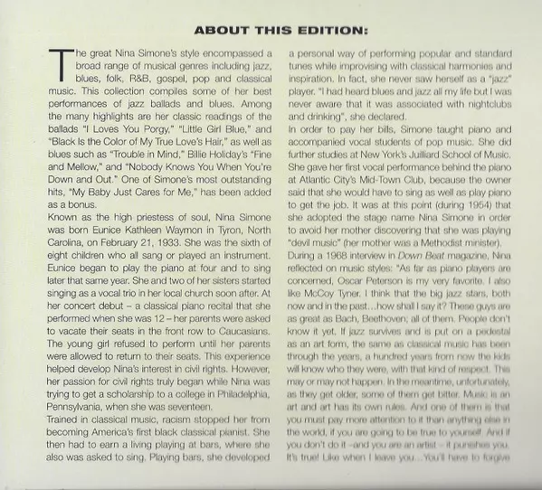 The great Nina Simone's unique style encompassed a wide range of musical genres including jazz, blues, folk, R&B, gospel, pop and classical. This collection contains some of her best interpretations of jazz ballads and blues. As a bonus, one of Simone's most notable hits, "My Baby Just Cares for Me" has been added.