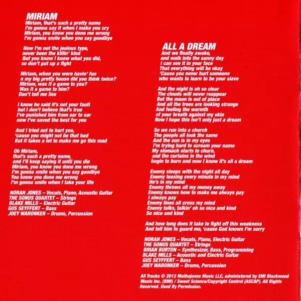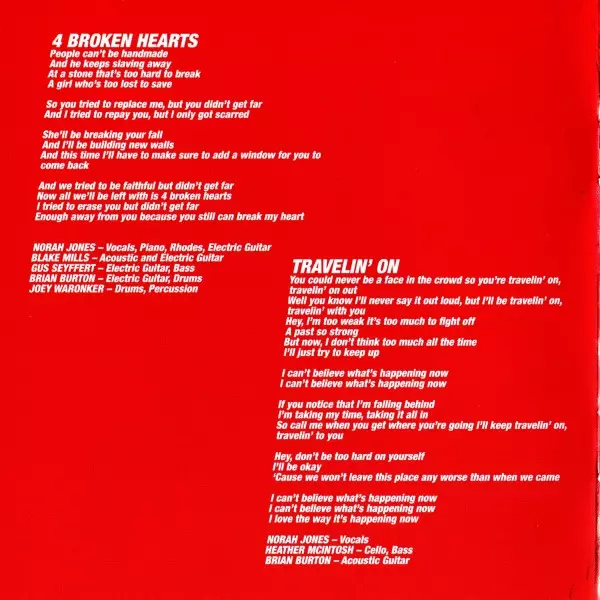 Acoustic Guitar, Electric Guitar Blake Mills | Drums, Percussion Joey Waronker | Electric Guitar, Bass Gus Seyffert | Electric Guitar, Drums Brian Burton | Vocals, Piano, Electric Piano [Rhodes], Electric Guitar Norah Jones