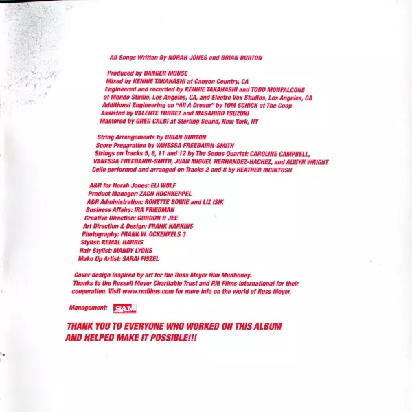 Electric Guitar Blake Mills | Electric Guitar, Bass, Backing Vocals Gus Seyffert | Strings Sonus Quartet | Synthesizer, Electric Guitar, Drums Brian Burton | Vocals, Piano, Electric Piano [Wurlitzer], Electric Guitar Norah Jones