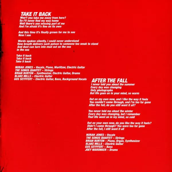 Bass Gus Seyffert | Drums Joey Waronker | Electric Guitar Blake Mills | Piano, Organ, Synthesizer Brian Burton | Strings Sonus Quartet | Vocals Norah Jones