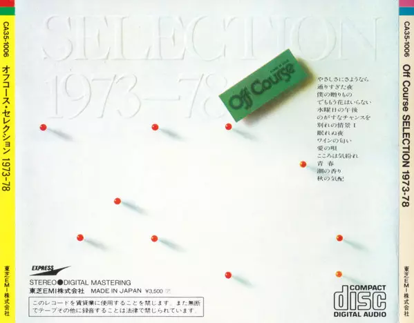 Off Course: Selection 1973-78 versie op CD in standaard editie. Deze specifieke uitgave werd uitgebracht in Japan bij uitgeverij Express op 21. januari 2009. Album valt binnen het genre Rock, Pop, Ballade, Pop Rock, Folk Rock, Kayōkyoku, Soft Rock en City Pop.