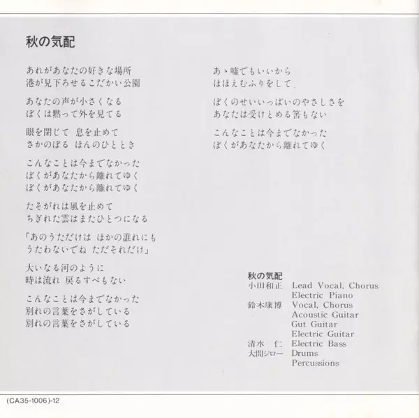 Drums Jiro Oma | Electric Bass Ryoji Koizumi | Harmonica Kazuhiko Matsuo | Lyrics By, Music By, Lead Vocals, Chorus, Electric Guitar, Guitar [Gut], Percussion Yasuhiro Suzuki | Vocals, Chorus, Electric Piano, Organ [Hammond Organ], Flute Kazumasa Oda
