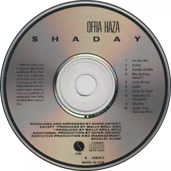 Ofra Haza: Shaday versie op CD in standaard editie. Deze specifieke uitgave werd uitgebracht in VS bij uitgeverij Sire op 25. oktober 1990. Album valt binnen het genre Folk, World, & Country, Elektronische muziek, Downtempo, Leftfield, Synth-Pop en Tribal.