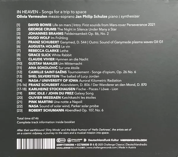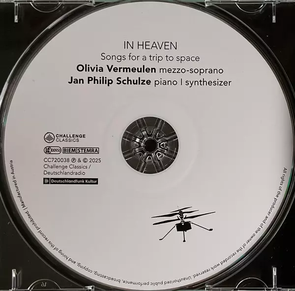 Jan Philip Schulze: In Heaven - Songs For A Trip To Space versie op CD in standaard editie. Deze specifieke uitgave werd uitgebracht in Europa bij uitgeverij Challenge Classics op 9. januari 2026. Album valt binnen het genre Pop, Klassieke muziek, Vocaal, Romance en Contemporary classical.