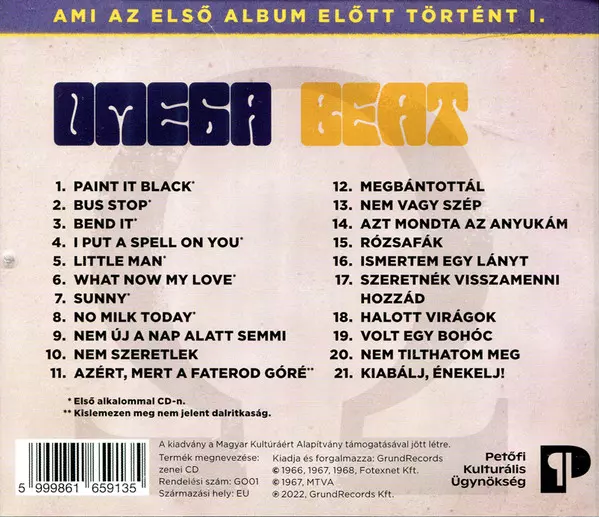 Omega: Beat versie op CD in standaard editie. Deze specifieke uitgave werd uitgebracht in Hongarije bij uitgeverij GrundRecords op 15. augustus 2022. Album kan worden geclassificeerd als genre Rock.