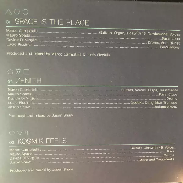 Bass Mauro Spada | Drums Davide Di Virgilio | Guitar, Synth [Xiosynth 19], Voice Marco Campitelli | Producer, Mixed By Jason Shaw (5) | Snare, Other [Treatments] Jason Shaw (5)