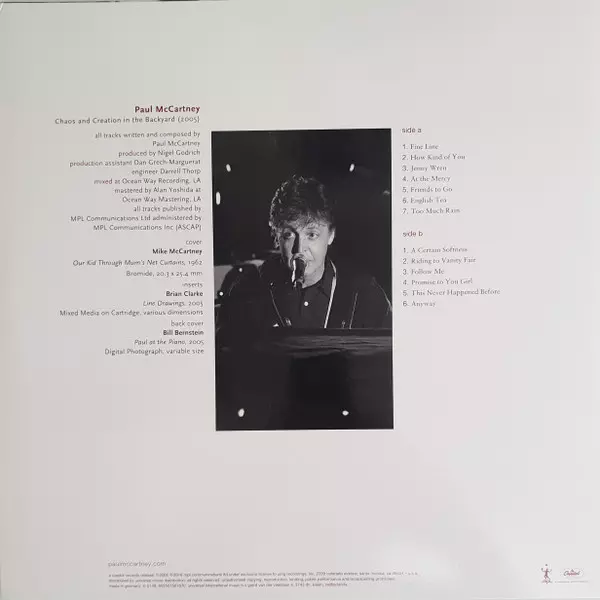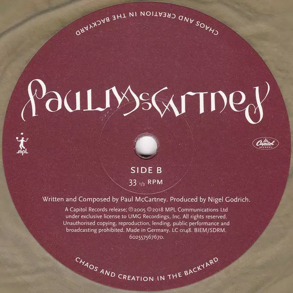 Paul McCartney: Chaos And Creation In The Backyard LTD | CLR versie op vinyl LP in limited gekleurde editie. Deze specifieke uitgave werd uitgebracht in Wereldwijd bij uitgeverij Capitol Records in samenwerking met MPL (2) op 18. mei 2018.