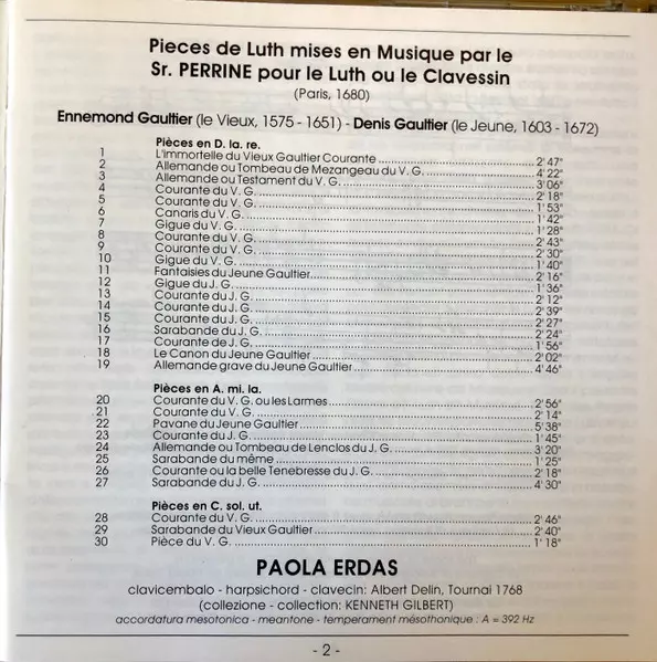 Paola Erdas: Pieces Pour Le Luth Ou Le Clavecin Mises En Musique Par Le Sr. Perrine, Paris 1680 versie op CD in standaard editie. Deze specifieke uitgave werd uitgebracht in Italië bij uitgeverij Stradivarius op 24. november 2006. Album valt binnen het genre Klassieke muziek en Barokmuziek.