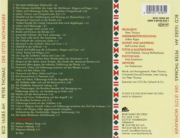 Peter Thomas: Der Letzte Mohikaner versie op CD in standaard editie. Deze specifieke uitgave werd uitgebracht in Duitsland bij uitgeverij Bear Family Records op 15. februari 2002. Album valt binnen het genre Stage & Screen en Soundtrack. Filmmusik.