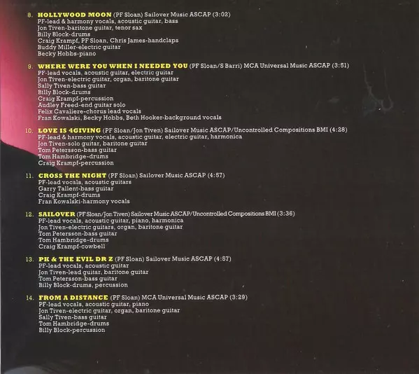 Baritone Guitar, Tenor Saxophone Jon Tiven | Drums Billy Block | Electric Guitar Buddy Miller | Handclaps Chris James, Craig Krampf, P.F. Sloan | Lead Vocals, Harmony Vocals, Acoustic Guitar, Bass P.F. Sloan | Piano Becky Hobbs