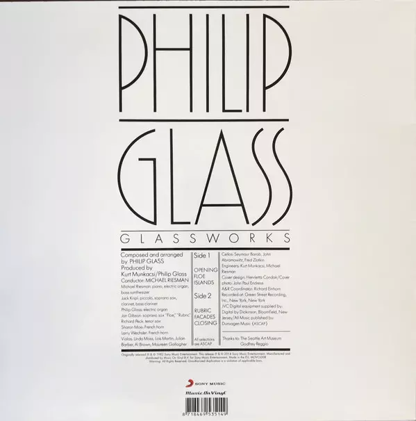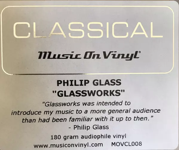 Glassworks is an album released in 1982 by Philip Glass . The album contains six pieces of music, all composed by Glass. The tracks range in length from just under two minutes to just over thirteen minutes, and the entire album is just over forty-five minutes long. Glassworks was Glass's first album released on CD and was also released on vinyl.