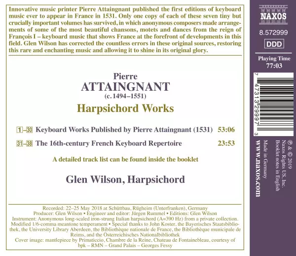 Glen Wilson: Harpsichord Works versie op CD in standaard editie. Deze specifieke uitgave werd uitgebracht in Duitsland bij uitgeverij Naxos op 12. april 2019. Album valt binnen het genre Klassieke muziek en Renaissance.