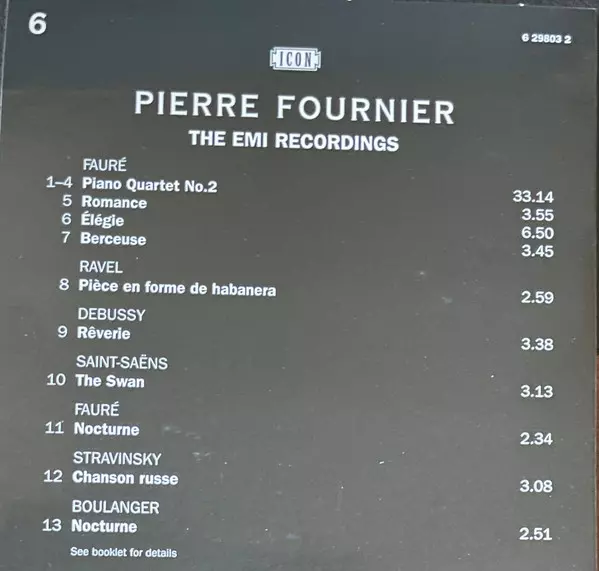 Pierre Fournier: The Aristocrat Of Cellists versie op 7CD/Doos in remastered editie. Deze specifieke uitgave werd uitgebracht in Europa bij uitgeverij EMI Classics op 14. september 2010. Album valt binnen het genre Klassieke muziek, Barokmuziek, Modernism, Romance en Impressionistic. Icon Series.