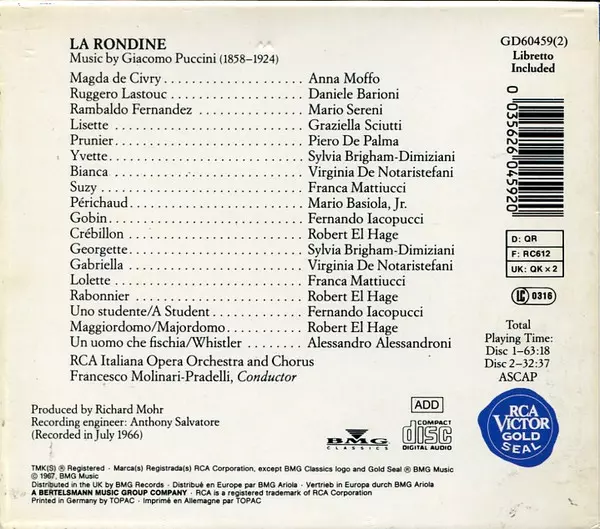 | Artiest | Giacomo Puccini | Anna Moffo | Graziella Sciutti | Mario Sereni | Francesco Molinari-Pradelli | RCA Italiana Opera Orchestra | RCA Italiana Opera Chorus | Piero De Palma | Daniele Barioni |