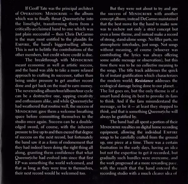 Empire vyšlo 20. srpna 1990 a je dosud komerčně nejúspěšnějším albem skupiny, které dosáhlo trojnásobné platiny. Obsahovalo hit "Silent Lucidity", který se dostal do Top 10 a byl nominován na dvě ceny Grammy, a skladbu "Jet City Woman". Následovníka přelomového alba Operation: Mindcrime produkoval Peter Collins a nahrávalo se ve Washingtonu a Va...
