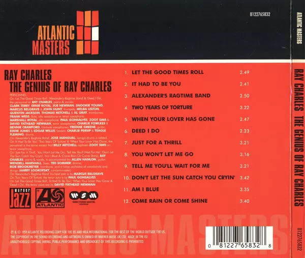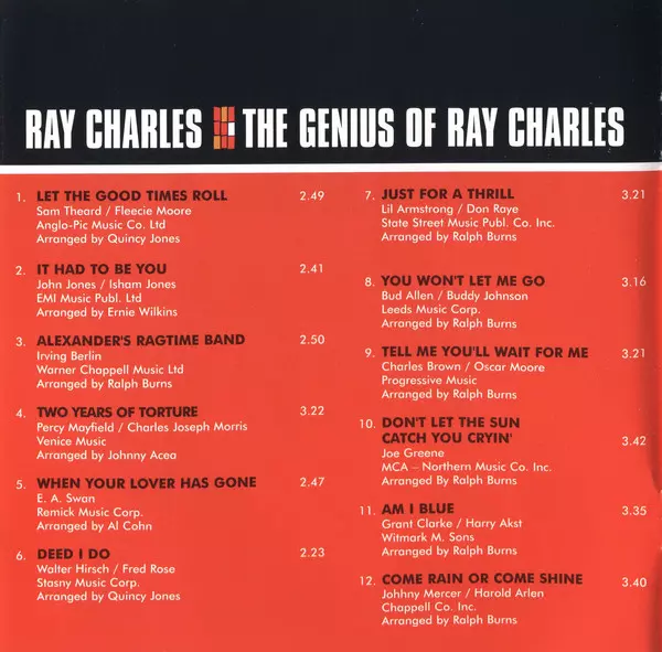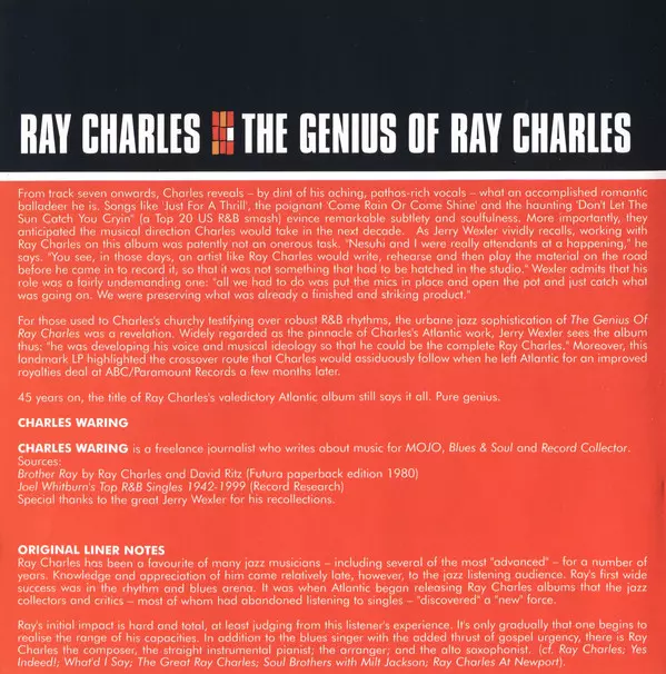 The Genius of Ray Charles is a 1959 album by Ray Charles. The album was his first release on the Atlantic label and features Charles' interpretations of other artists' songs and four original Charles compositions. The album was commercially and critically successful and helped establish Charles as one of the leading figures in soul music.
