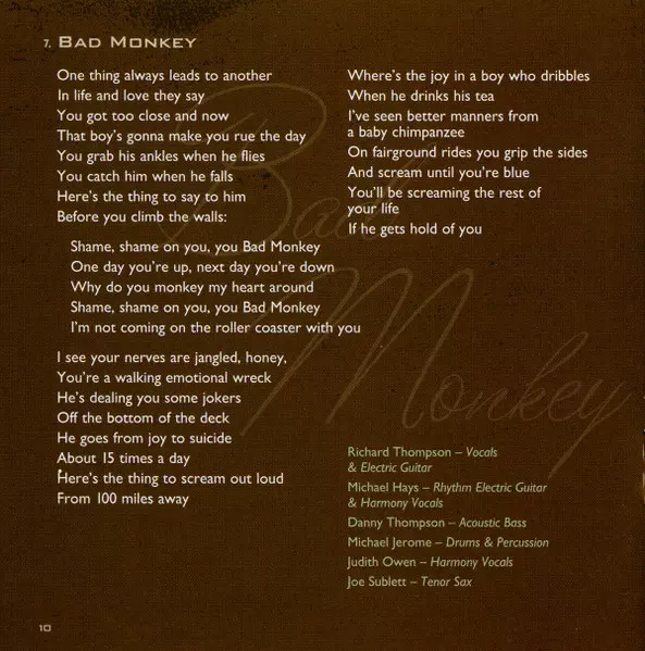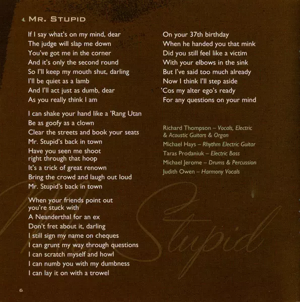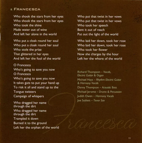 Acoustic Bass Danny Thompson | Drums, Percussion Michael Jerome | Electric Guitar [Rhythm], Harmony Vocals Michael Hays | Harmony Vocals Judith Owen | Tenor Saxophone Joe Sublett | Vocals, Electric Guitar, Organ Richard Thompson