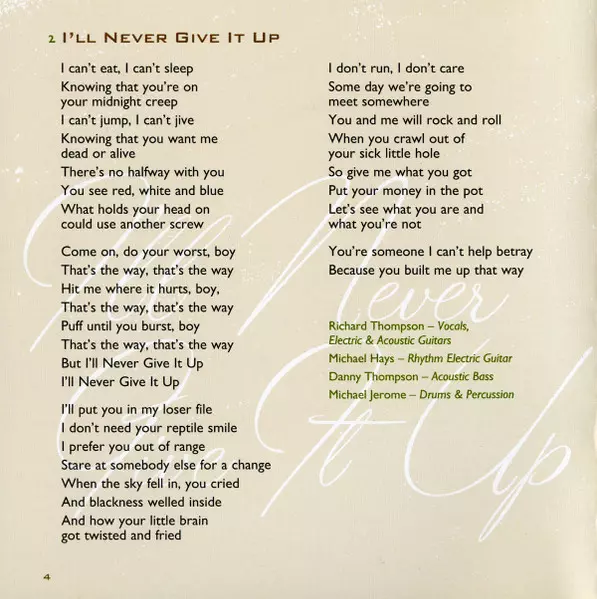 Acoustic Bass Danny Thompson | Drums, Percussion Michael Jerome | Electric Guitar [Rhythm] Michael Hays | Vocals, Electric Guitar, Acoustic Guitar Richard Thompson
