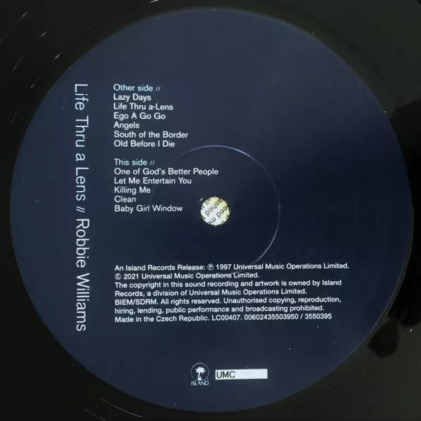 Robbie Williams: Life Thru A Lens versie op vinyl LP in standaard editie. Deze specifieke uitgave werd uitgebracht in Europa bij uitgeverij Island Records op 24. september 2021.