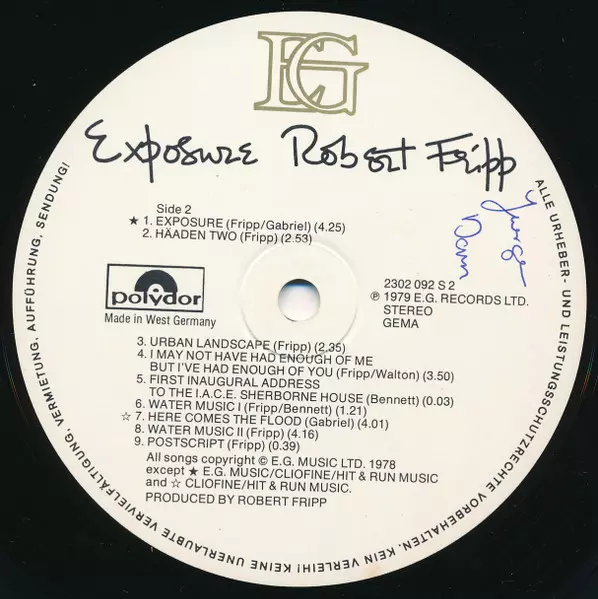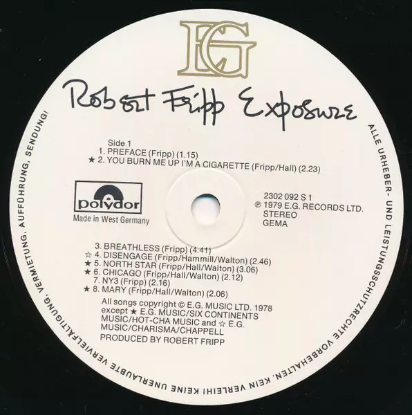 Robert Fripp: Exposure versie op vinyl LP in standaard editie. Deze specifieke uitgave werd uitgebracht in Duitsland bij uitgeverij EG in samenwerking met Polydor in het jaar 1979. Album valt binnen het genre Rock, Elektronische muziek, Alternative rock, Experimental, Ambient en Dance-pop.