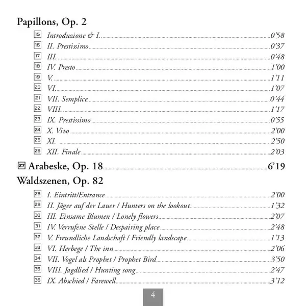 | Titel | Kinderszenen, Op. 15 / Abegg Variations, Op. 1 / Papillons, Op. 2 / Arabeske, Op. 18 / Waldszenen, Op. 82 |