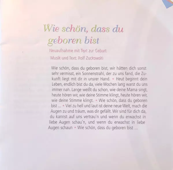 | 2 | Rolf Zuckowski, Anuschka Zuckowski: Wie Schön, Das Du Geboren Bist (Neuaufnahme Mit Text Zur Geburt) | 2:27 min | |