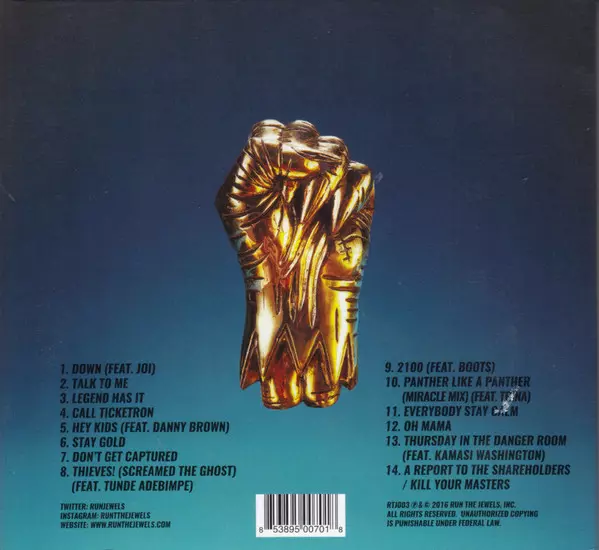 "Run The Jewels 3" is the third studio album by the American hip-hop duo Run The Jewels, which consists of rapper/producer El-P and rapper Killer Mike. Released on December 24, 2016, the album features a collection of fourteen tracks that showcase the duo's signature hard-hitting beats and sharp, politically charged lyrics. Among these tracks are the energetic opener "Talk To Me," the defiant "Legend Has It," and the reflective "Thursday In The Danger Room." Other notable songs include "Stay Gold," "Down," and "2100," which features a guest appearance by Boots. The album continues to explore themes of social justice, systemic oppression, and political activism, all delivered with the aggressive and intricate wordplay for which Run The Jewels is known. "Run The Jewels 3" was well-received by critics and fans alike for its production quality and timely commentary, further cementing the duo's place in contemporary hip-hop.