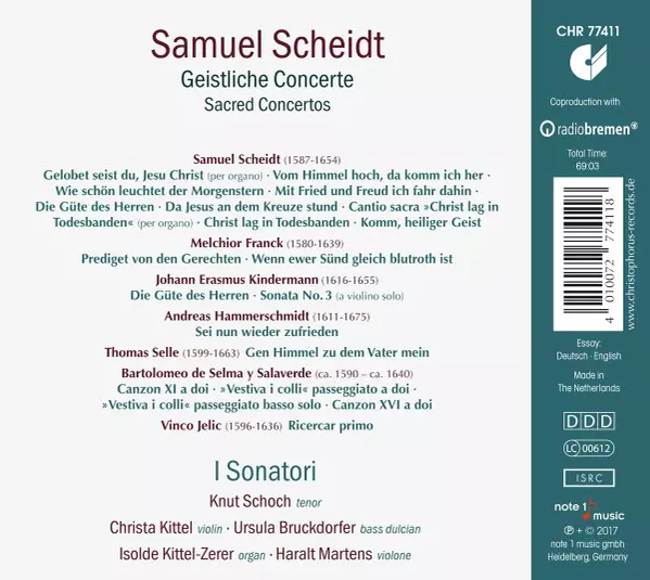 Samuel Scheidt: Geistliche Konzerte - Sacred Concertos versie op CD in standaard editie. Deze specifieke uitgave werd uitgebracht in Duitsland bij uitgeverij Christophorus op 5. mei 2017. Album valt binnen het genre Klassieke muziek, Barokmuziek en Renaissance Music. Ausz..