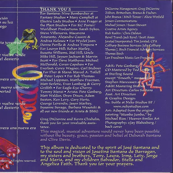 | Bass Benny Rietveld | Congas Paul Rekow | Drums Rodney Holmes | Engineer Jeff Poe, Jim Gaines, John Karpowich, Steve Fontano | Engineer [Assistant] Michael Anderson (3) | Keyboards Chester Thompson (2) | Mixed By Jeff Poe | Percussion, Vocals Karl Perazzo | Producer, Guitar, Bells [Sleigh] Carlos Santana | Producer, Programmed By, Accordion, Vocals KC Porter | Trombone Mic Gillette, Ramon Flores | Trumpet Jose Abel Figueroa, Marvin McFadden, Mic Gillette | Vocals Tony Lindsay | Written-By Carlos Santana, Rachid Taha, Tony Lindsay | |||