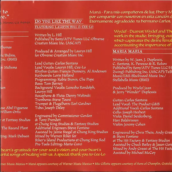 | Cello Joseph Hébert | Engineer Andy Grassi, Chris Theis, Steve Fontano | Engineer [Assistant] Chuck Bailey, Jason Groucott | Guitar Carlos Santana | Lead Vocals The Product G&B | Mixed By Andy Grassi | Mixed By [Assistant] Michael McCoy | Producer Jerry Duplessis, Jerry Duplessis, Wyclef Jean, Wyclef Jean | Viola Danny Seidenberg, David Balakrishnan | Violin Jeremy Cohen | Vocals The Product G&B | Vocals [Additional] Carlos Santana | Written-By Carlos Santana, Jerry Duplessis, Karl Perazzo, Raul Rekow, Wyclef Jean | |||