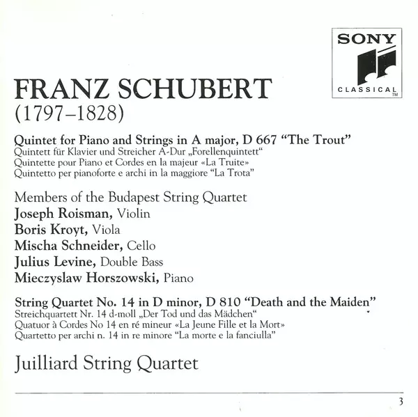 | Artiest | Franz Schubert | Juilliard String Quartet | Budapest String Quartet | Mieczyslaw Horszowski |