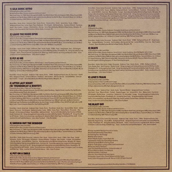 Alto Saxophone Kirk Smothers | Backing Vocals, Bass, Guitar, Organ, Piano, Keyboards D'Mile | Guitar [Additional] Ella Feingold | Producer Bruno Mars, D'Mile | Recorded By [Bootsy Collins] Tobe Donohue | Recorded By [Horns] Boo Mitchell | Trombone, Vocals Kameron Whalum | Trumpet Marc Franklin | Vocals Bootsy Collins, Jimmy King (9) | Vocals, Drums Anderson .Paak | Vocals, Guitar Bruno Mars | Written-By Brandon Paak Anderson, Bruno Mars, Dernst Emile