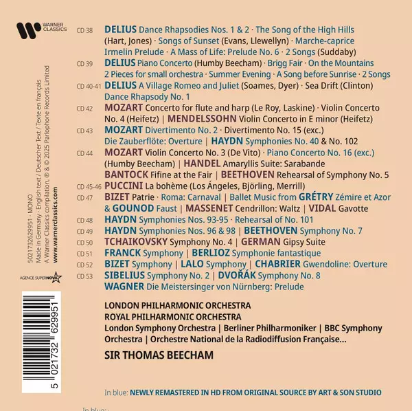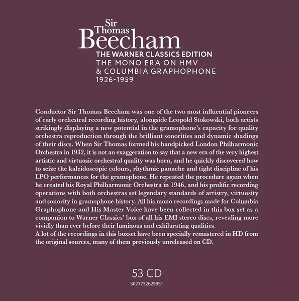 Sir Thomas Beecham: The Mono Era on HMV & Columbia Graphophone 1926-1959 versie op 53CD/Doos in standaard editie. Deze specifieke uitgave werd uitgebracht in Europa, VK en VS bij uitgeverij Warner op 16. januari 2026. Album valt binnen het genre Klassieke muziek, Orchestral, Romanticism en Concerto.