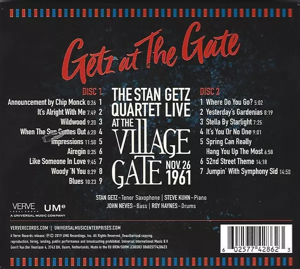 „Getz At The Gate” is a previously unreleased 1961 live recording from the historic Village Gate in New York City. This release features an all-star, rarely heard quartet with pianist Steve Kuhn, bassist John Neves and drummer Roy Haynes (aka 'The Boston Band'). Includes extensive liner notes by Boston jazz historian Bob Blumenthal.