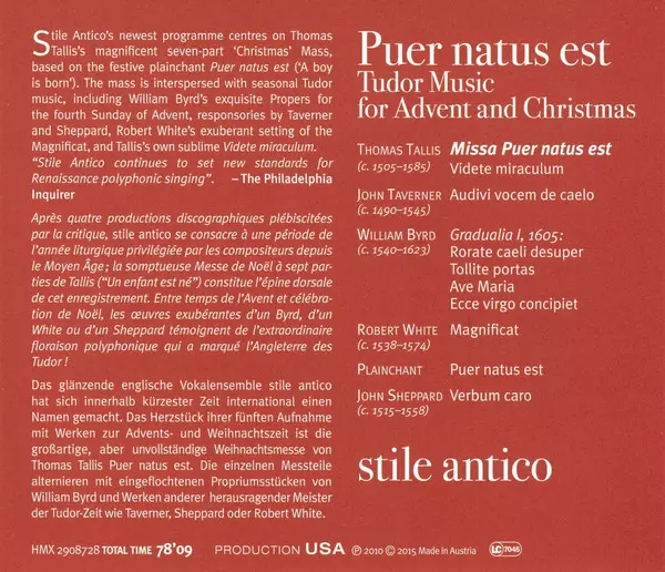 Stile Antico: A Musical Journey Into The English Renaissance versie op 3CD/Doos in standaard editie. Deze specifieke uitgave werd uitgebracht in Europa bij uitgeverij Harmonia Mundi op 23. oktober 2015. Album valt binnen het genre Klassieke muziek en Renaissance Music.