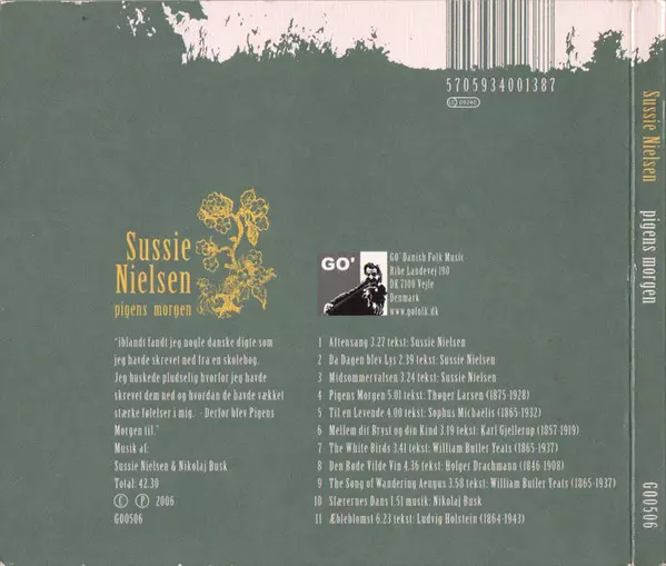 Sussie Nielsen: Pigens Morgen versie op CD in standaard editie. Deze specifieke uitgave werd uitgebracht in Denemarken bij uitgeverij GO' Danish Folk Music op 20. februari 2017. Album kan worden geclassificeerd als genre Folk, World, & Country.