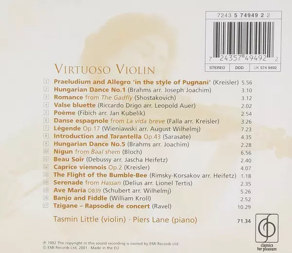 Piers Lane: Virtuoso Violin versie op CD in standaard editie. Deze specifieke uitgave werd uitgebracht in Europa bij uitgeverij EMI Records Ltd. in samenwerking met Classics For Pleasure op 2. april 2002. Album kan worden geclassificeerd als genre Klassieke muziek.