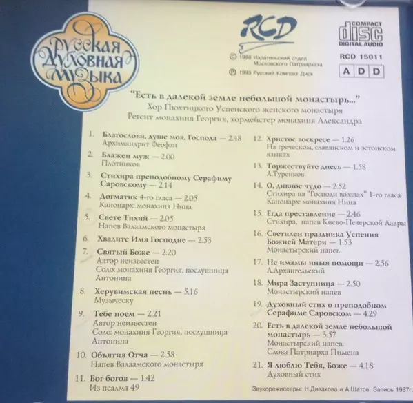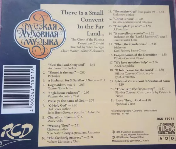 Хор Пюхтицкого Свято-Успенского Женского Монастыря: Есть В Далекой Земле Небольшой Монастырь... = There Is A Small Convent In The Far Land... versie op CD in standaard editie. Deze specifieke uitgave werd uitgebracht in Rusland bij uitgeverij RCD (2) op 13. augustus 2003. Album valt binnen het genre Klassieke muziek, Non-Music en Religious.