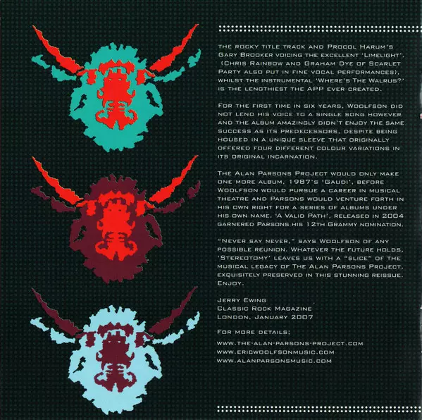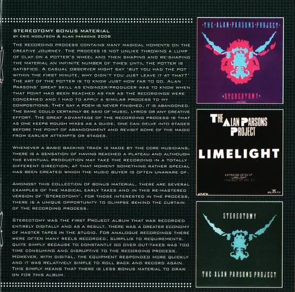 The Alan Parsons Project: Stereotomy versie op CD in remastered editie. Deze specifieke uitgave werd uitgebracht in Europa bij uitgeverij Sony BMG Music Entertainment in samenwerking met Arista en Legacy op 4. mei 2009. Album valt binnen het genre Rock, Pop, Pop Rock en Art Rock. Expanded.