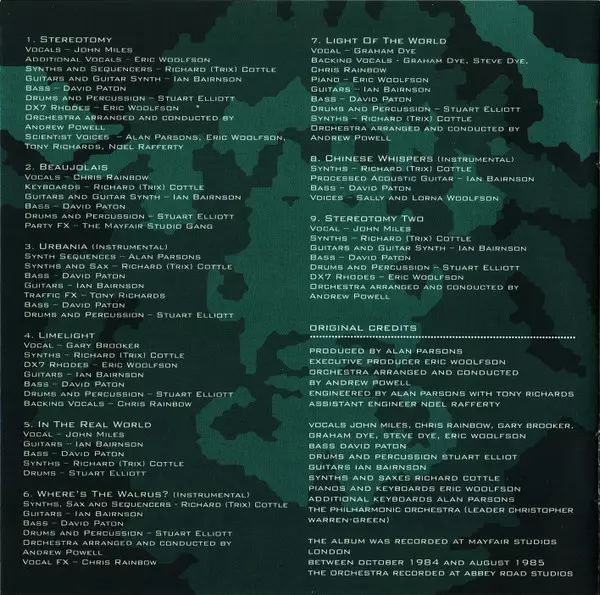 Arranged By [Orchestra Arranged By], Conductor [Orchestra Conducted By] Andrew Powell | Bass David Paton | Drums, Percussion Stuart Elliott | Guitar, Guitar Synthesizer [Guitar Synth] Ian Bairnson | Synthesizer [DX7], Electric Piano [Rhodes] Eric Woolfson | Synthesizer, Sequencer [Sequencers] Richard Cottle | Vocals John Miles | Vocals [Additonal] Eric Woolfson | Voice [Scientist Voices] Alan Parsons, Eric Woolfson, Noel Rafferty, Tony Richards