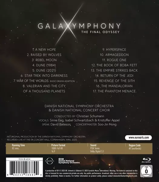 DR SymfoniOrkestret: Galaxymphony (The Final Odyssey) versie op Blu-ray in standaard editie. Deze specifieke uitgave werd uitgebracht in Denemarken bij uitgeverij EuroArts op 19. december 2025. Album valt binnen het genre Stage & Screen en Soundtrack.